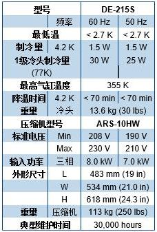 产品介绍 DE-215是ARS生产的最高制冷量的制冷机。该款制冷机更适合应用于需要更高的制冷量,而且降温要求更迅速的系统中。 特点: • 无液氦 • 振动低 • 可靠性高 • 4K冷头(1.5W@4.2K) • 维护容易 • 价格优势 • 更安静 标准组成: • 冷头(DE-215S) • 压缩机(ARS-10HW) • 2根柔性高压氦气传输管 规格: